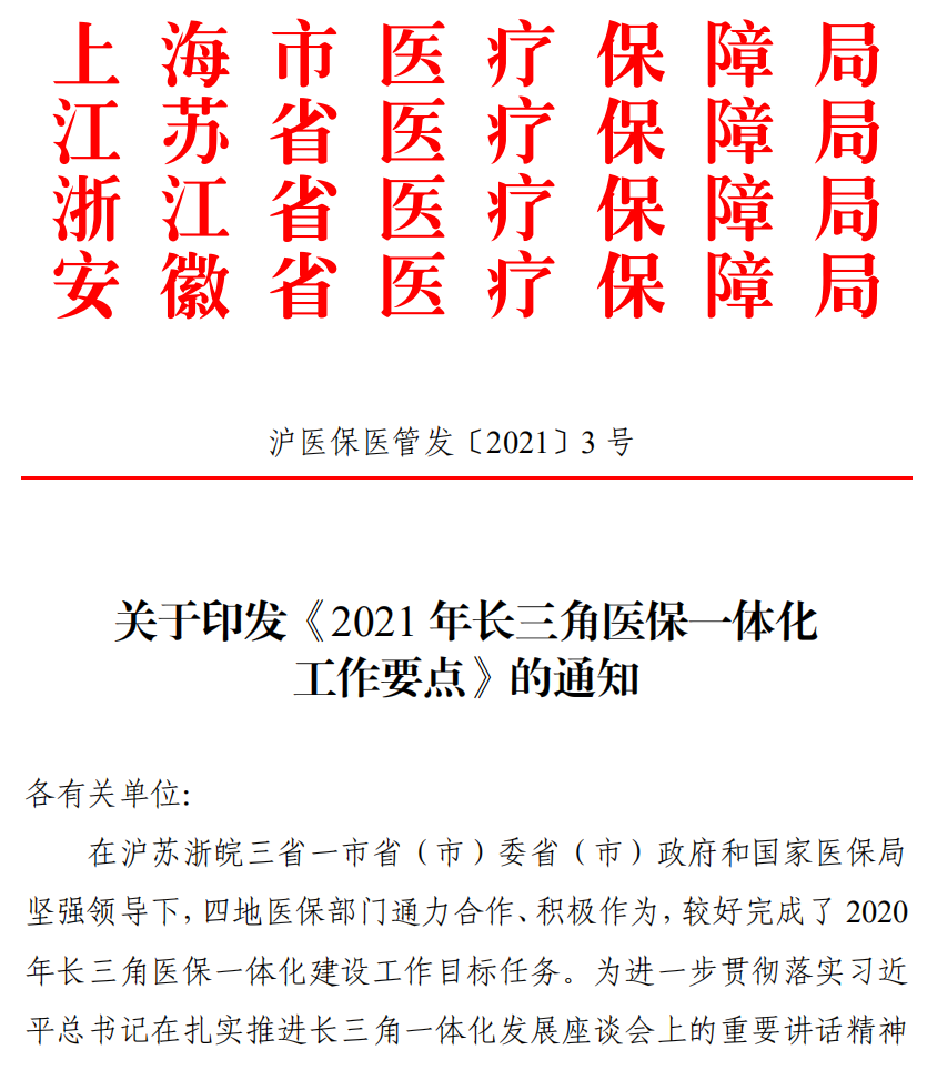 近日,一份名為《2021年長三角醫(yī)保一體化工作要點(diǎn)》的通知在業(yè)內(nèi)流傳。文件顯示由上海、江蘇、浙江、安徽三省一市的醫(yī)保局聯(lián)合發(fā)布。