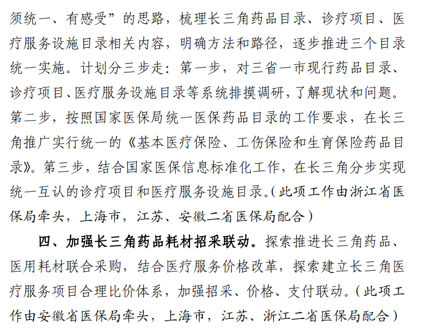 結(jié)合國家醫(yī)保信息標(biāo)準(zhǔn)化工作,在長三角分步實(shí)現(xiàn)統(tǒng)一互認(rèn)的診療項(xiàng)目和醫(yī)療服務(wù)設(shè)施目錄。