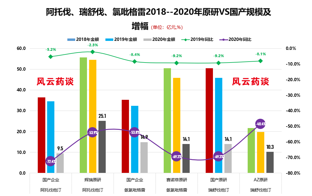 幾個大品種的格局:阿托伐、瑞舒伐、氯吡格雷國采前后國產(chǎn)VS原研規(guī)模及增幅對比
