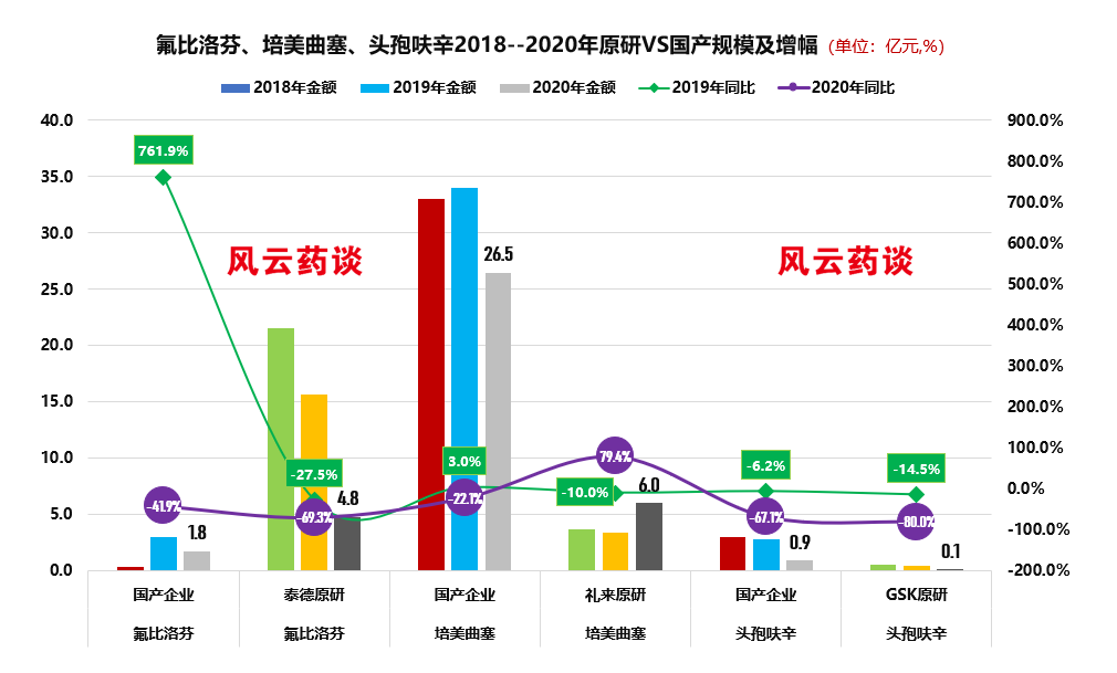 量價齊減:氟比洛芬、培美曲塞、頭孢呋辛國采前后國產(chǎn)VS原研規(guī)模及增幅對比