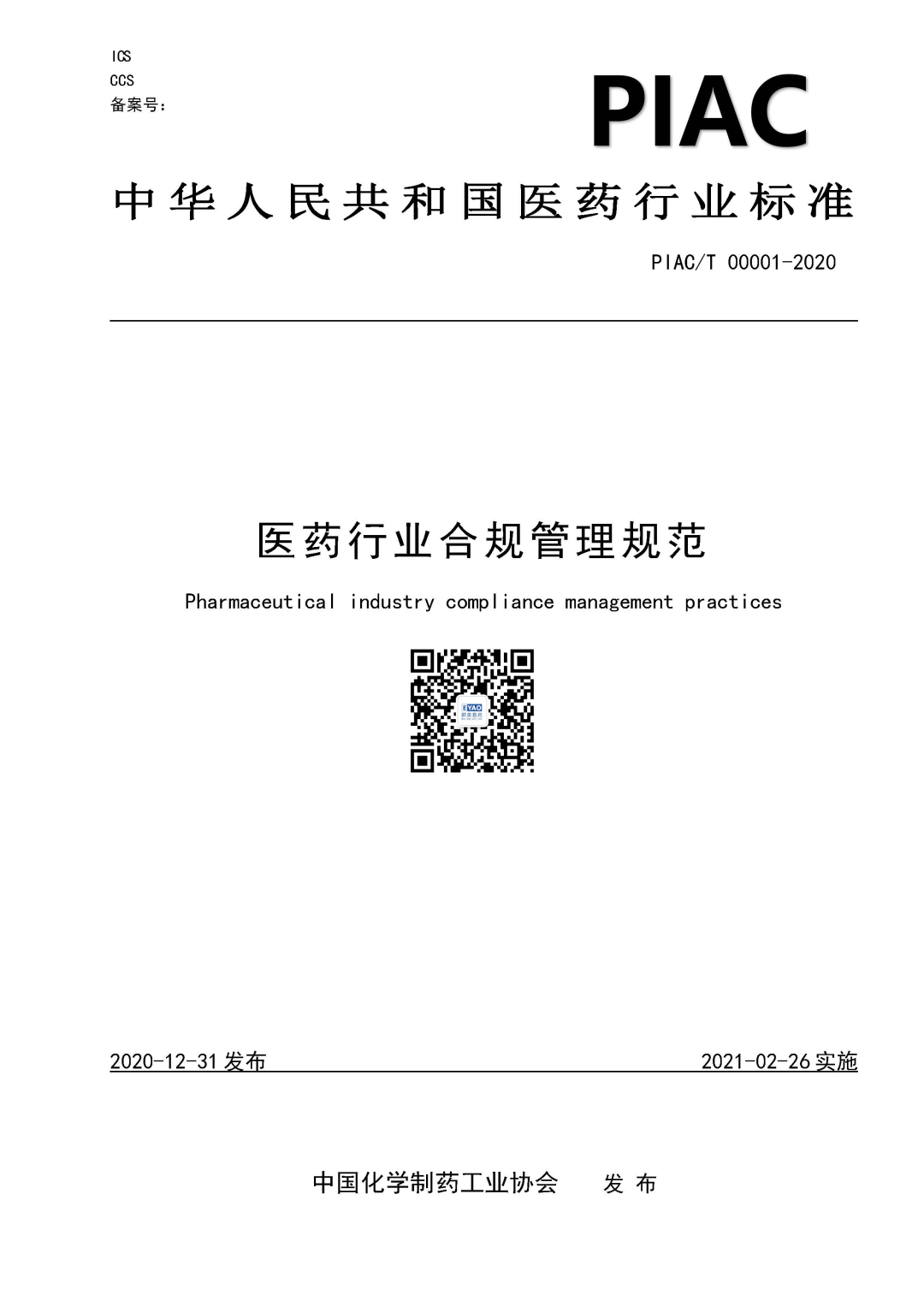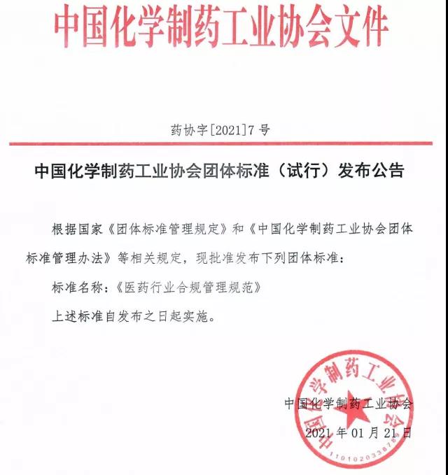 近日,《醫(yī)藥行業(yè)合規(guī)管理規(guī)范》標準由中國化學制藥工業(yè)協(xié)會(CPIA)正式發(fā)布!