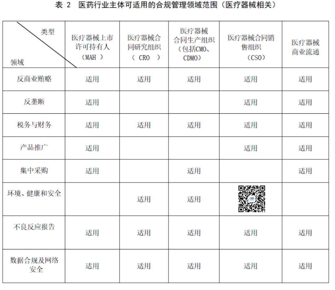 其中,附錄A-H為合規(guī)管理的八個具體領(lǐng)域,合規(guī)管理規(guī)范對藥品和醫(yī)療器械的MAH、CRO、CMO/CDMO、CSO以及商業(yè)流通企業(yè)等五個不同身份進行了合規(guī)領(lǐng)域明確了適用范圍: