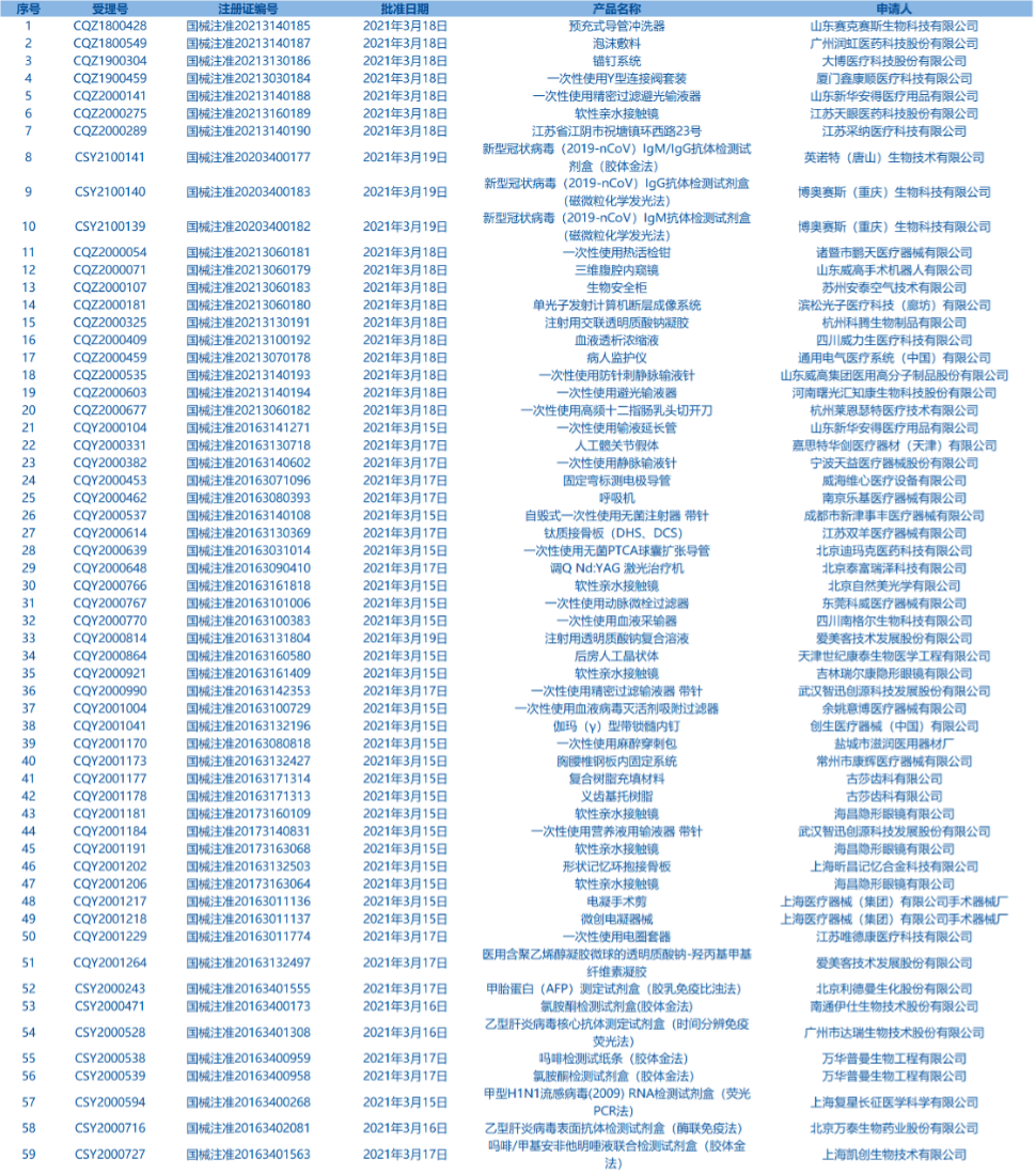 2.國家藥監(jiān)局發(fā)布5期醫(yī)療器械批準(zhǔn)證明文件(準(zhǔn)產(chǎn))待領(lǐng)信息,共包括59個(gè)受理號(hào),涉及上海凱創(chuàng)生物技術(shù)有限公司等企業(yè)。(截至3月28日)