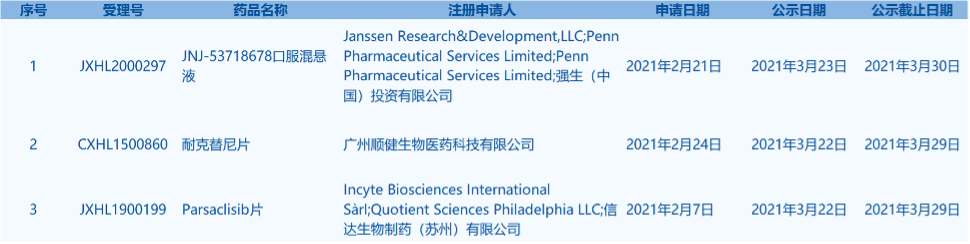 5.CDE網(wǎng)站信息顯示,耐克替尼片等3個(gè)藥品被列入擬突破性治療品種。(截至3月28日)