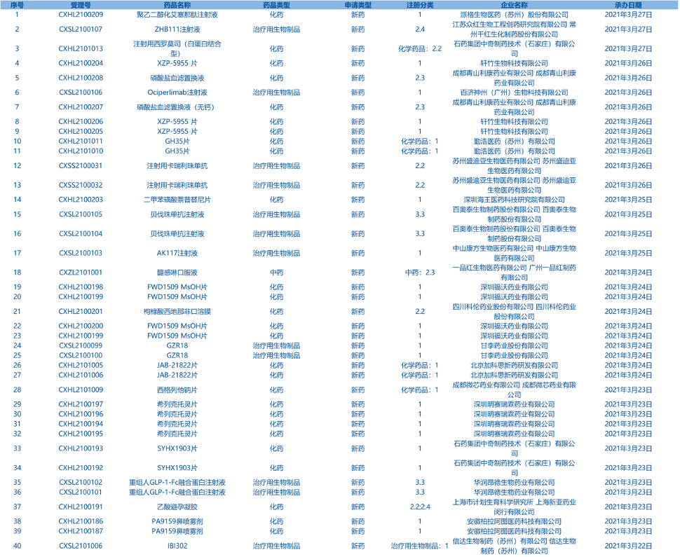 6.CDE承辦受理40個(gè)新藥上市申請(qǐng),包括注射用卡瑞利珠單抗等藥品。(截至3月28日)