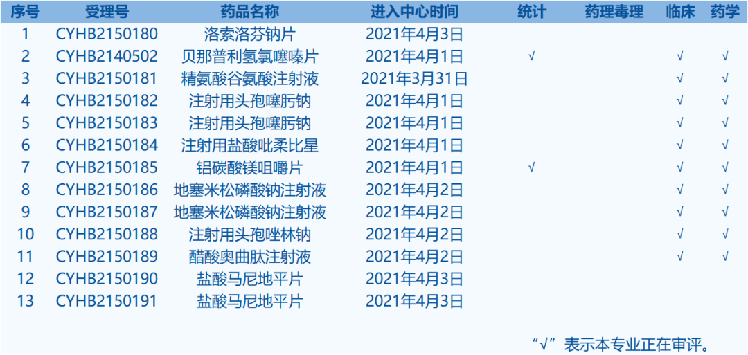 3.CDE網(wǎng)站公示13個(gè)仿制藥一致性評(píng)價(jià)任務(wù),涉及洛索洛芬鈉片等藥品。(截至4月5日)