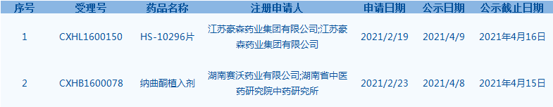 5.CDE網(wǎng)站信息顯示,HS-10296片和納曲酮植入劑被列入擬突破性治療品種。(截至4月11日)