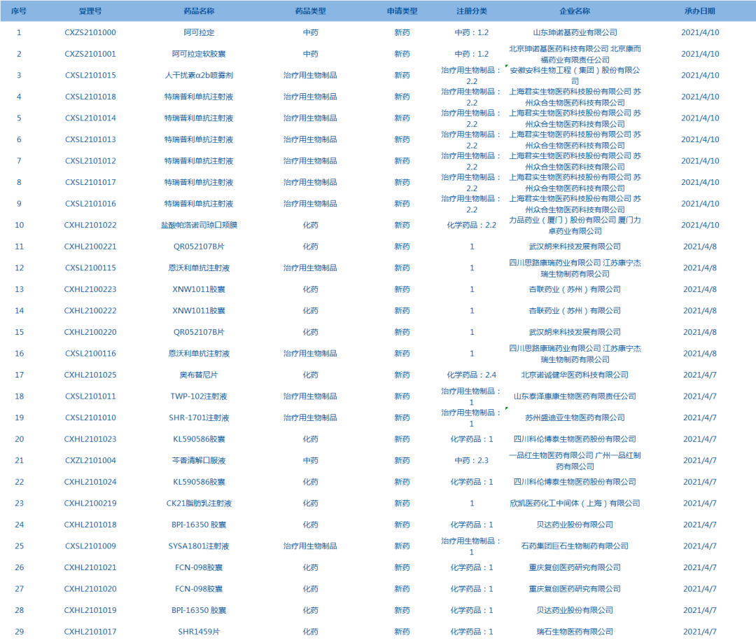 6.CDE承辦受理29個(gè)新藥上市申請(qǐng),包括特瑞普利單抗注射液等藥品。(截至4月11日)
