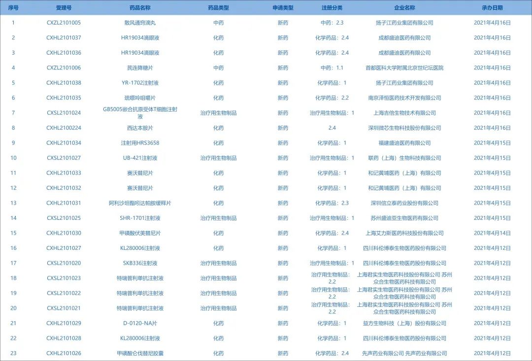 5.CDE承辦受理23個新藥上市申請,包括散風(fēng)通竅滴丸等藥品。(截至4月18日)
