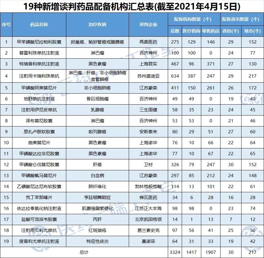 4月30日,國(guó)家醫(yī)保局召開(kāi)了《2020年國(guó)家醫(yī)保目錄新準(zhǔn)入的部分談判藥品配備機(jī)構(gòu)參考名單(第一批)發(fā)布會(huì)》,會(huì)上公布了19種臨床優(yōu)先使用,可替代性不強(qiáng)的新增談判藥品的醫(yī)療機(jī)構(gòu)和零售藥店配備情況(數(shù)據(jù)截至2021年4月15日)。