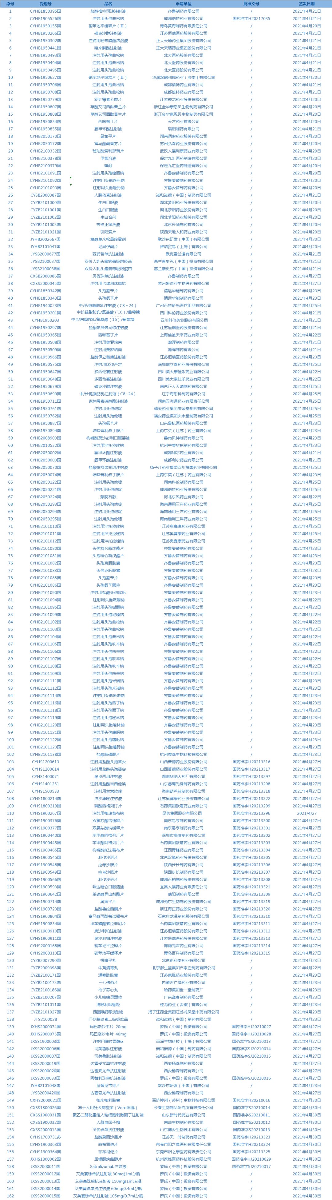 5.國家藥監(jiān)局發(fā)布3期藥品批準(zhǔn)證明文件待領(lǐng)信息,共包括162個(gè)受理號(hào),涉及齊魯制藥有限公司等企業(yè)。(截至5月7日)