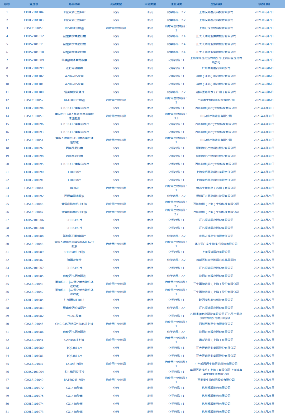 8.CDE承辦受理51個(gè)新藥上市申請(qǐng),包括卡左雙多巴控釋片等藥品。(截至5月7日)