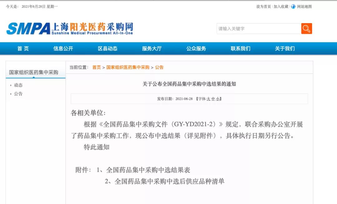 (6月28日)下午,上海陽(yáng)光醫(yī)藥采購(gòu)網(wǎng)發(fā)布《關(guān)于公布全國(guó)藥品集中采購(gòu)中選結(jié)果的通知》——經(jīng)過(guò)3天的公示期后,上海陽(yáng)光采購(gòu)網(wǎng)正式公布中選結(jié)果。