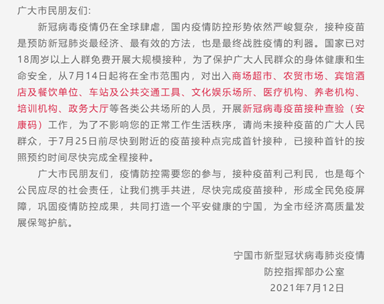 昨日晚間,據(jù)微信公眾號“寧國發(fā)布”消息,從7月14日起將在寧國全市范圍內(nèi),對出入醫(yī)療機構(gòu)、商場超市、農(nóng)貿(mào)市場、賓館酒店及餐飲單位、車站及公共交通工具、文化娛樂場所、政務大廳等各類公共場所的人員,開展新冠病毒疫苗接種查驗(安康碼)工作,為了不影響正常工作生活秩序,要求未接種疫苗的廣大人民群眾,于7月25日前盡快到附近的疫苗接種點完成首針接種,已接種首針的按照預約時間盡快完成全程接種。