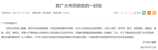 7月12日,四川省宜賓市高縣新冠肺炎疫情應急指揮部發(fā)布《高縣疫情防控通告》。通告要求,凡年滿18周歲以上(戶籍不限)且無疫苗禁忌癥的人員均須接種。7 月27日起,原則上不允許未接種人員(有禁忌癥除外)進入醫(yī)療機構(gòu)住院部、政務中心、養(yǎng)老院、托兒所、學校(幼兒園、校外培訓機構(gòu))、景區(qū)景點、監(jiān)所等重點場所。