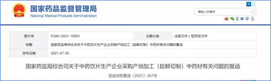 圖1:2021年7月5日,國家食藥監(jiān)局對飲片產(chǎn)地初加工復(fù)函