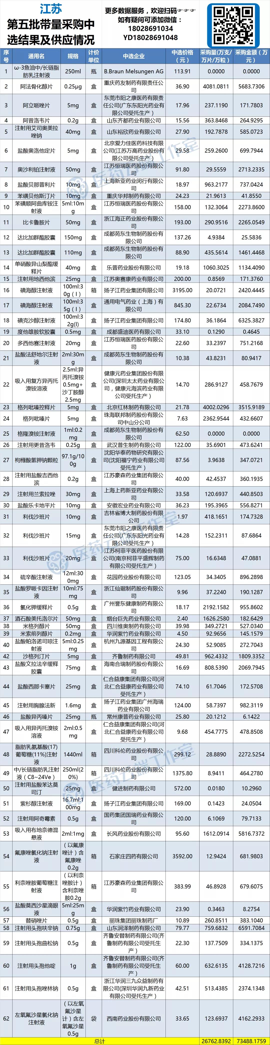 經(jīng)醫(yī)藥云端工作室測(cè)算,江蘇省第五批國(guó)采中選品種的首年約定采購(gòu)金額約為7.3億元(詳見下表)。