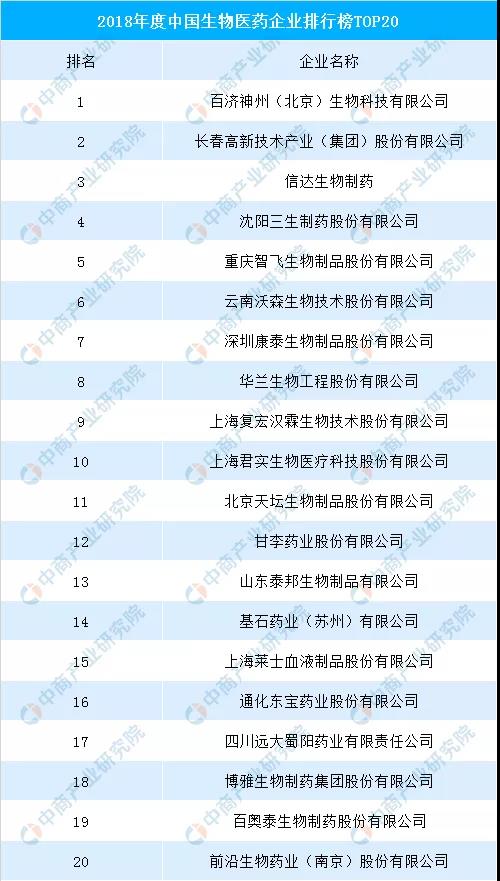2018年度中國生物醫(yī)藥(含血液制品、疫苗、胰島素等)企業(yè)TOP20排行榜中,百濟神州、長春高新、信達生物位列前三甲。具體榜單如下: