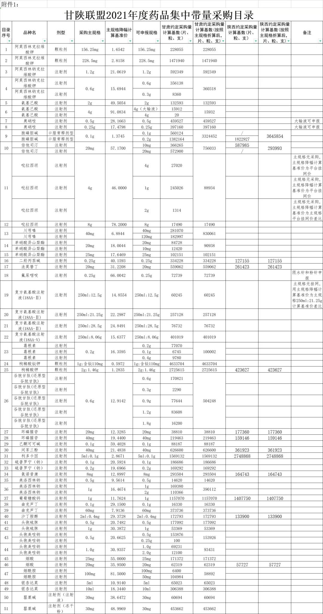 據(jù)7月23日甘肅省公共資源交易中心發(fā)布的《甘陜聯(lián)盟2021年度藥品集中帶量采購文件》,本次采購涉及34個大品種,大多數(shù)為注射劑,涉及糖尿病、高血壓、抗菌類、消化系統(tǒng)、心血管系統(tǒng)等治療領(lǐng)域,包含阿莫西林克拉維酸鉀、奧硝唑、胞磷膽堿等在各省集采中頻繁出現(xiàn)的品種(詳細情況見文末)。