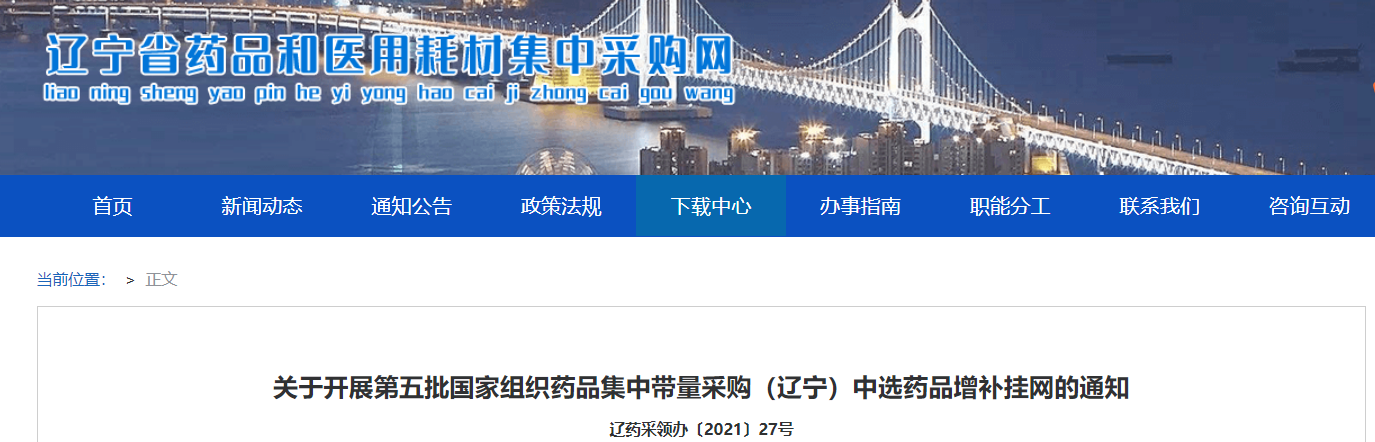 近日,遼寧省藥品和醫(yī)用耗材集中采購網(wǎng)發(fā)布《關(guān)于開展第五批國家組織藥品集中帶量采購(遼寧)中選藥品增補掛網(wǎng)的通知 遼藥采領(lǐng)辦〔2021〕27號》。