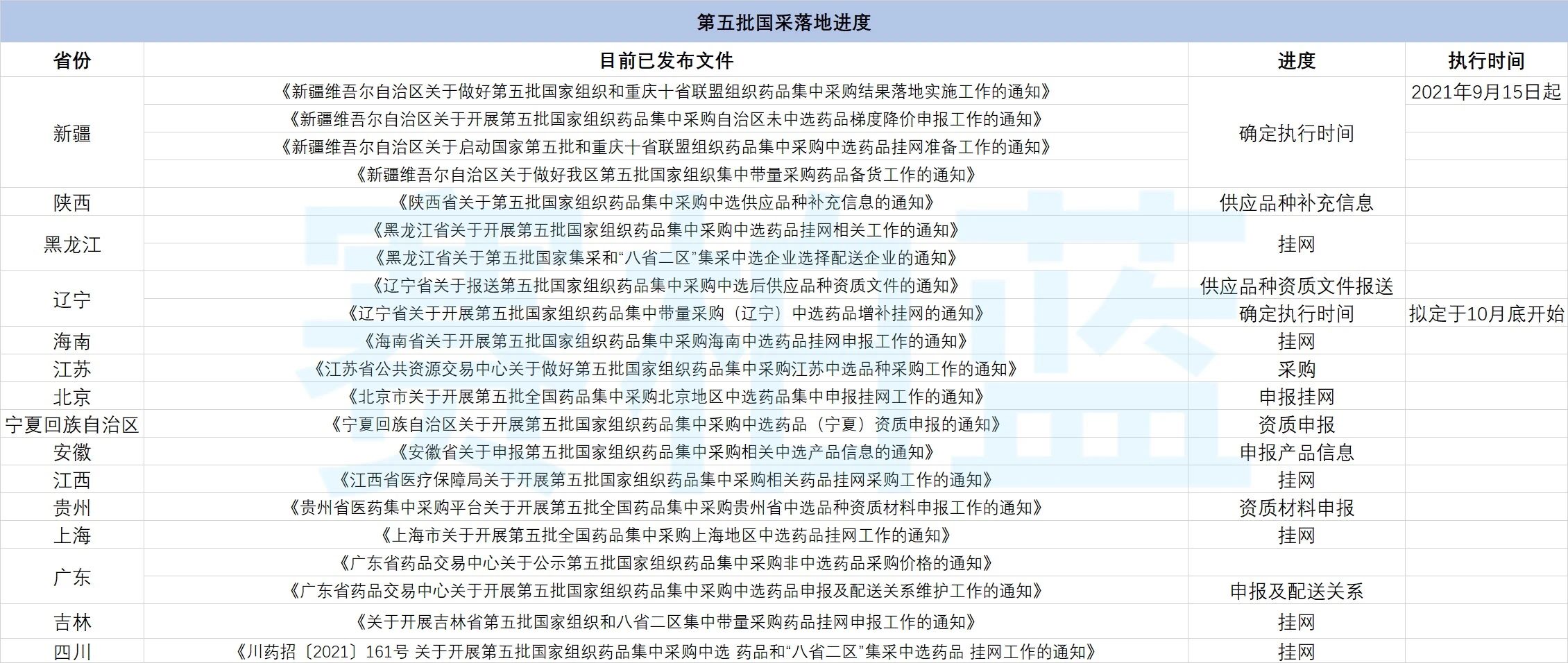遼寧省和新疆都已確定第五批國采執(zhí)行時間,目前來看,和之前央視新聞報道的“預計今年10月患者可用上降價藥品”時間基本一致,其他省份也陸續(xù)確定了掛網(wǎng)時間,相信執(zhí)行時間也指日可待。