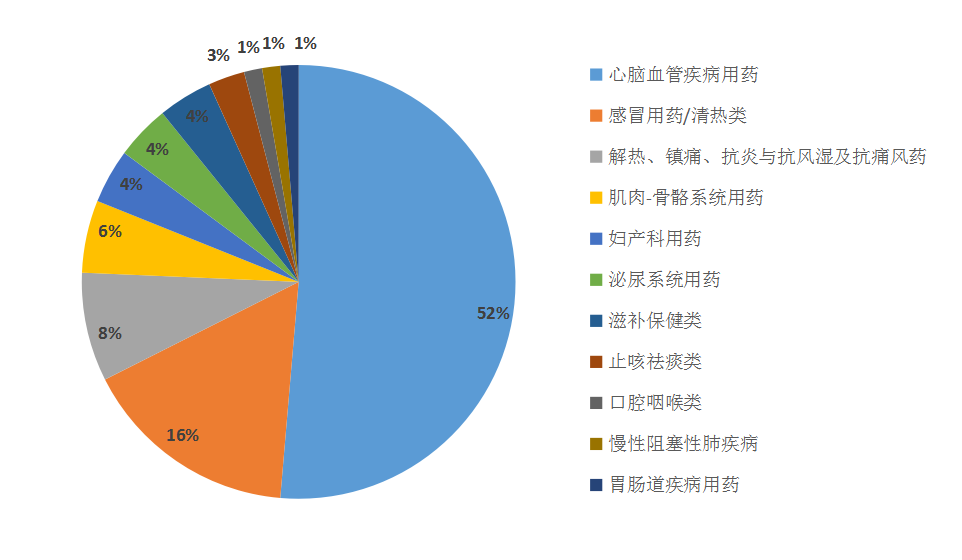 從中康CMH分類來看,此次中成藥集采的74個產(chǎn)品涉及11個類別,其中心腦血管疾病用藥(不含高血壓)的產(chǎn)品最多,包括血栓通、血塞通、銀杏葉、丹參等共有38個產(chǎn)品,占比52%;其次是感冒用藥/清熱類產(chǎn)品有12個,占比16%。