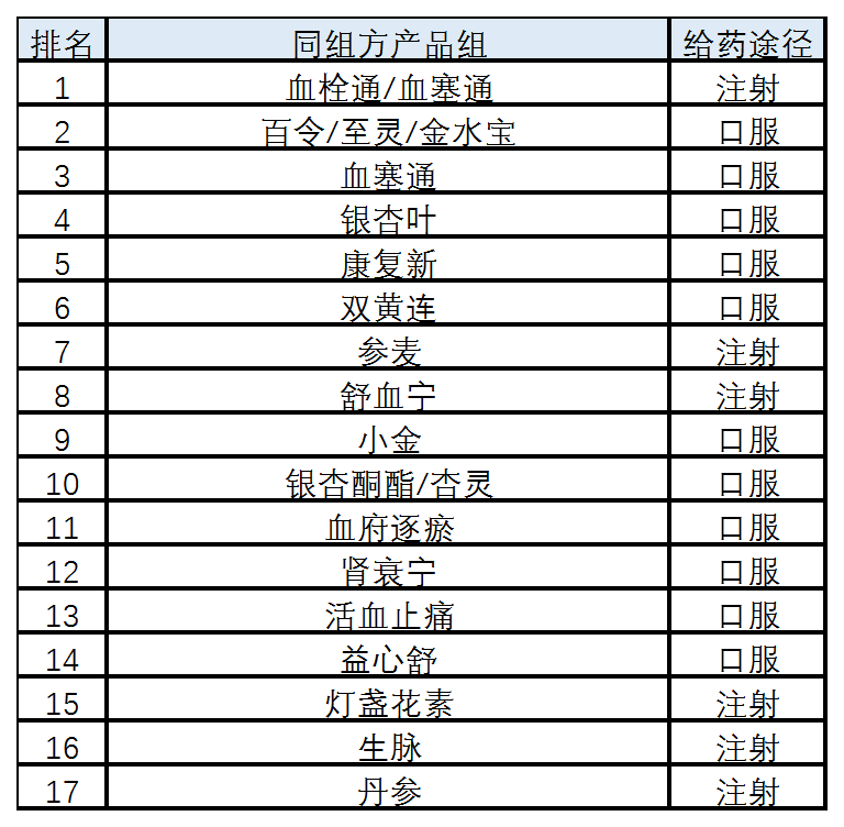 表1 2020年17個同組方產(chǎn)品組市場規(guī)模排名情況