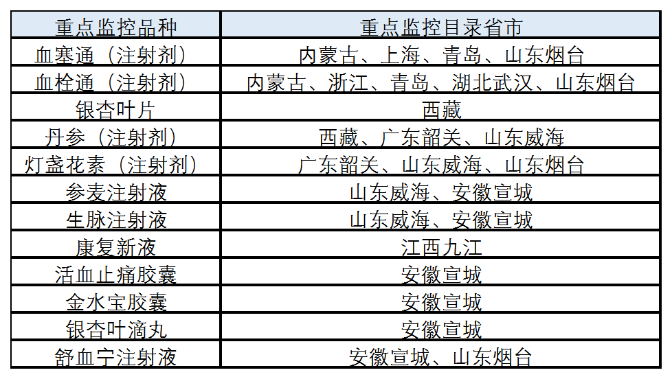 本次中成藥帶量集采的74個品種中有16個品種出現(xiàn)在地方重點監(jiān)控目錄中,其中,血栓通(注射劑)納入內(nèi)蒙古(2018)、上海、青島、山東煙臺的重點監(jiān)控目錄,血栓通(注射劑)納入內(nèi)蒙古(2018)、浙江、青島、湖北武漢、山東煙臺的重點監(jiān)控目錄,參麥注射液納入山東威海、安徽宣城納入重點監(jiān)控目錄,燈盞花(注射劑)納入廣東韶關(guān)、山東威海、山東煙臺的重點監(jiān)控目錄,康復(fù)新液納入江西九江的重點監(jiān)控目錄等。