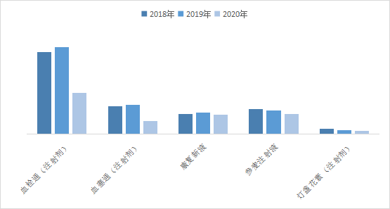 從17個同組方產(chǎn)品組市場規(guī)模來看,中康CMH開思系統(tǒng)數(shù)據(jù)顯示,2018~2020年血栓通/血塞通注射劑、百令/至靈/金水寶口服制劑、血塞通口服制劑、銀杏葉口服制劑、康復(fù)新口服制劑分別占據(jù)前五名,值得關(guān)注的是,雖然血栓通/血塞通注射劑受到政策的影響市場規(guī)模出現(xiàn)明顯下降的情況,但從排名來看仍然位居第一的位置。