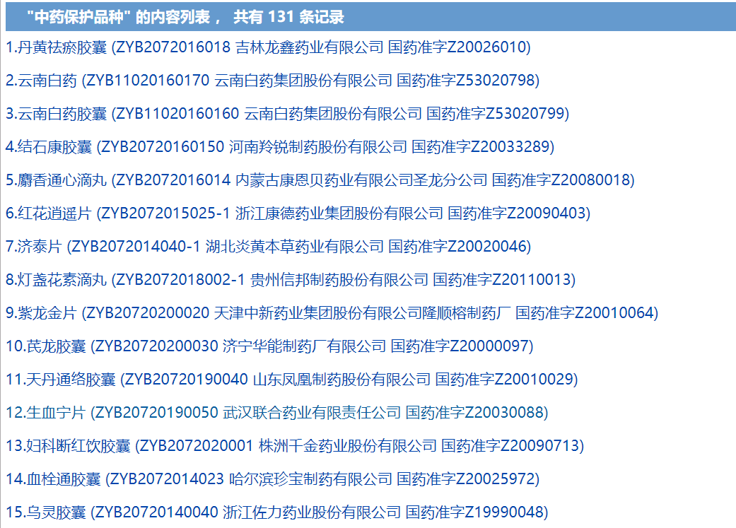 賽柏藍(lán)查詢國(guó)家藥監(jiān)局官網(wǎng)發(fā)現(xiàn),目前已有131個(gè)產(chǎn)品被納入中藥保護(hù)品種。
