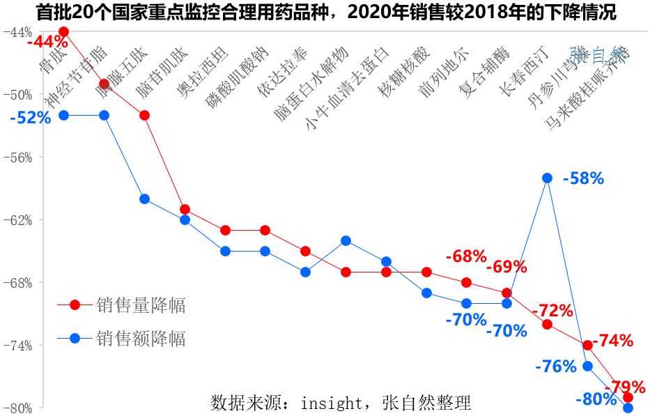 此前首批納入的20個(gè)品種銷售都遭遇了大幅下滑,下圖展示了部分重點(diǎn)監(jiān)控品種2020年銷售額與2018年的比較,無論是銷售額還是銷售量都全部被腰斬,其中馬來酸桂哌齊特的銷售額和銷售量都下降了八成。