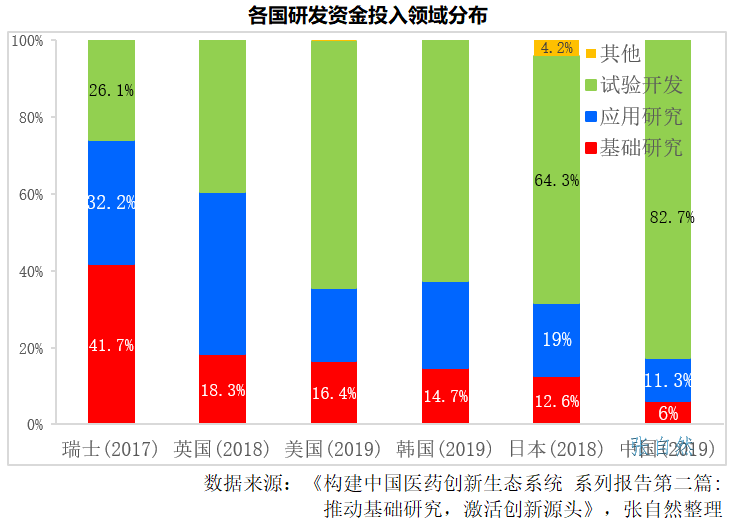 近年來,我國的醫(yī)藥創(chuàng)新發(fā)展迅速,但仍以跟隨式高仿為主,原創(chuàng)的東西較少,主要是我國基礎(chǔ)研究氛圍和投入都不足,如2019年我國用于基礎(chǔ)研究的資金僅占研發(fā)總投入的6%,而瑞士(2017)、英國(2018)、美國(2019)、韓國(2019)和日本(2018)則分別占到了41.7%、18.3%、16.4%、14.7%和12.6%,目前的研發(fā)內(nèi)卷也是體現(xiàn),證券市場(chǎng)也已敲響了警鐘,加強(qiáng)源頭創(chuàng)新才能提高競(jìng)爭力。