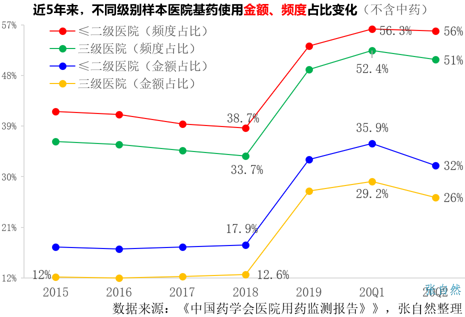 自2009年我國實(shí)施基本藥物制度以來,基本藥物經(jīng)歷了先快速發(fā)展又逐漸回落的過程,由于近年不斷出臺(tái)鼓勵(lì)政策,基本藥物又恢復(fù)發(fā)展,在臨床的使用頻度和金額方面都明顯上升,如二、三級(jí)醫(yī)院的使用頻度占比分別由2018年的38.7%、33.7%提升到了2020年第二季度的56%和51%,使用金額占比分別由2018年的17.9%、12.6%提升到了2020年第二季度的32%和26%。