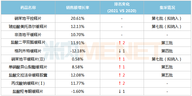 銷售額TOP10品種中有2個緩控釋制劑,且均為高血壓用藥,分別為排在首位的硝苯地平控釋劑型及排位第五的美托洛爾緩釋劑型。