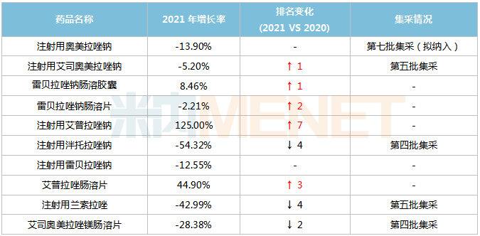 雖然質子泵抑制劑在售品種數(shù)不多,但大多數(shù)為銷售超10億的大品種,市場受集采影響較大。暢銷品種注射用泮托拉唑鈉被納入第四批集采,其銷售額由2020年的超40億元下滑至2021年的近20億元,降幅超過50%,排名下降4個位次。