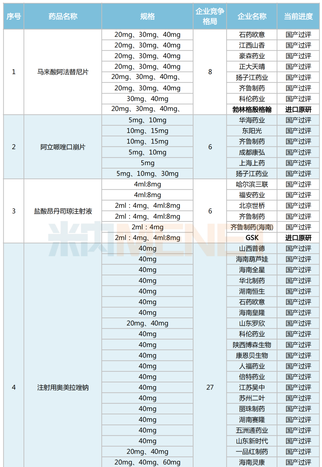 排位第三、第四的雷貝拉唑鈉腸溶膠囊、雷貝拉唑鈉腸溶片暫無企業(yè)過評,但布局一致性評價合計企業(yè)數(shù)已超過10家;排位第七的注射用雷貝拉唑鈉也有5家企業(yè)提交一致性評價補充申請或以新分類報產(chǎn)。
