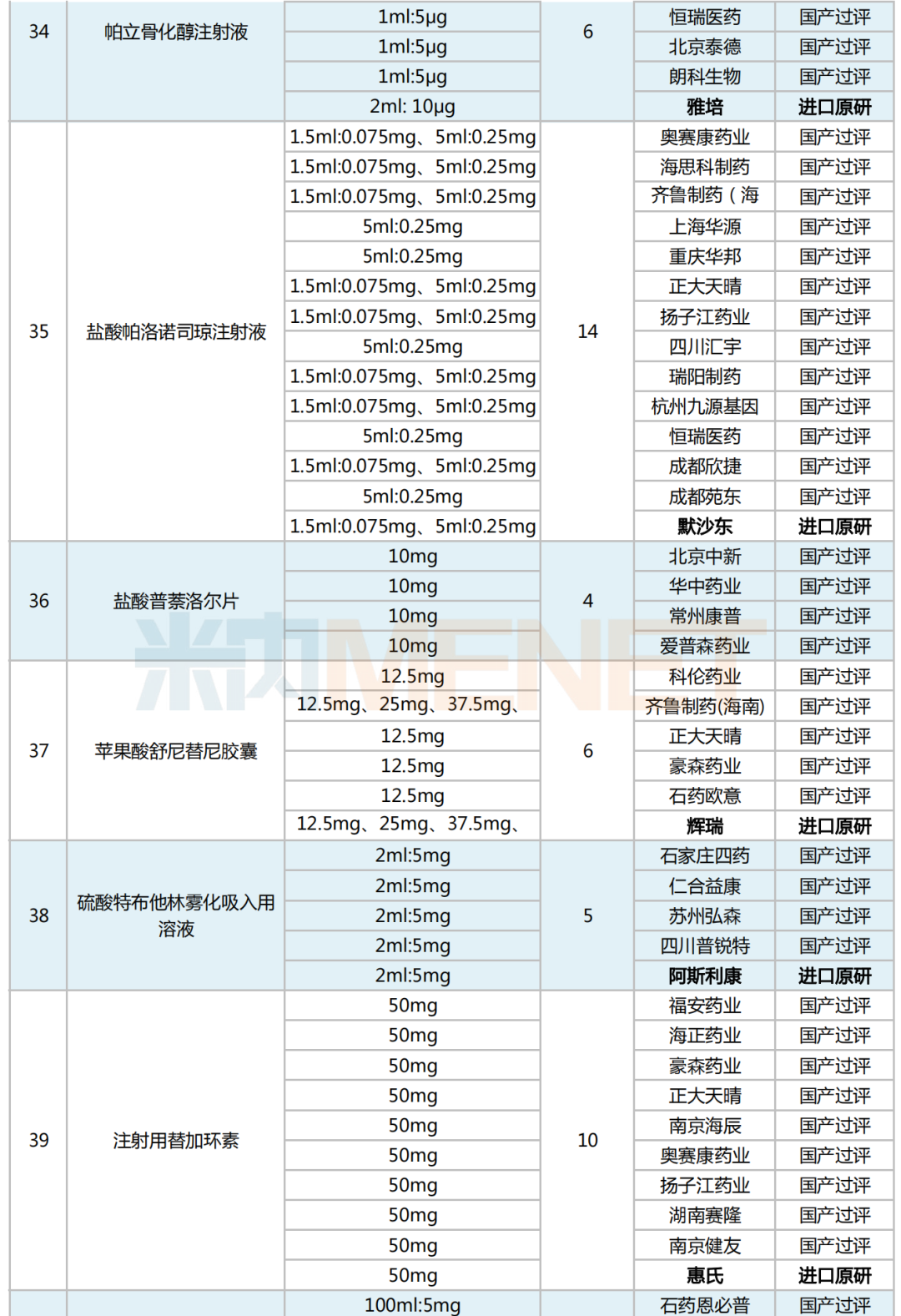 奧美拉唑注射劑競爭最激烈,已有28家藥企滿足競爭條件,頭孢克肟口服常釋劑型、替加環(huán)素注射劑、硝苯地平控釋劑型滿足條件企業(yè)數(shù)也達10家及以上;奧曲肽注射劑相對緩和,含原研廠家在內(nèi),有4家藥企滿足條件。