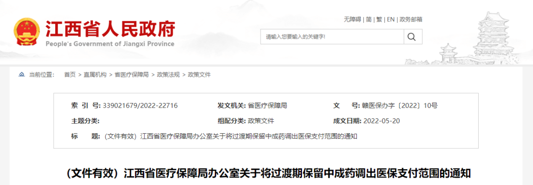 以近期發(fā)布的江西省《將過渡期保留中成藥調出醫(yī)保支付范圍的通知》為例,其中,對50個省增補中成藥(以藥品名稱計)的醫(yī)保支付標準進行調整,其中43個藥品自2022年7月1日零時起醫(yī)保停止支付。