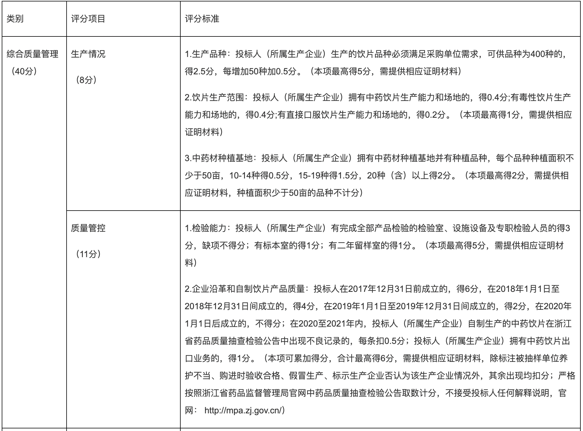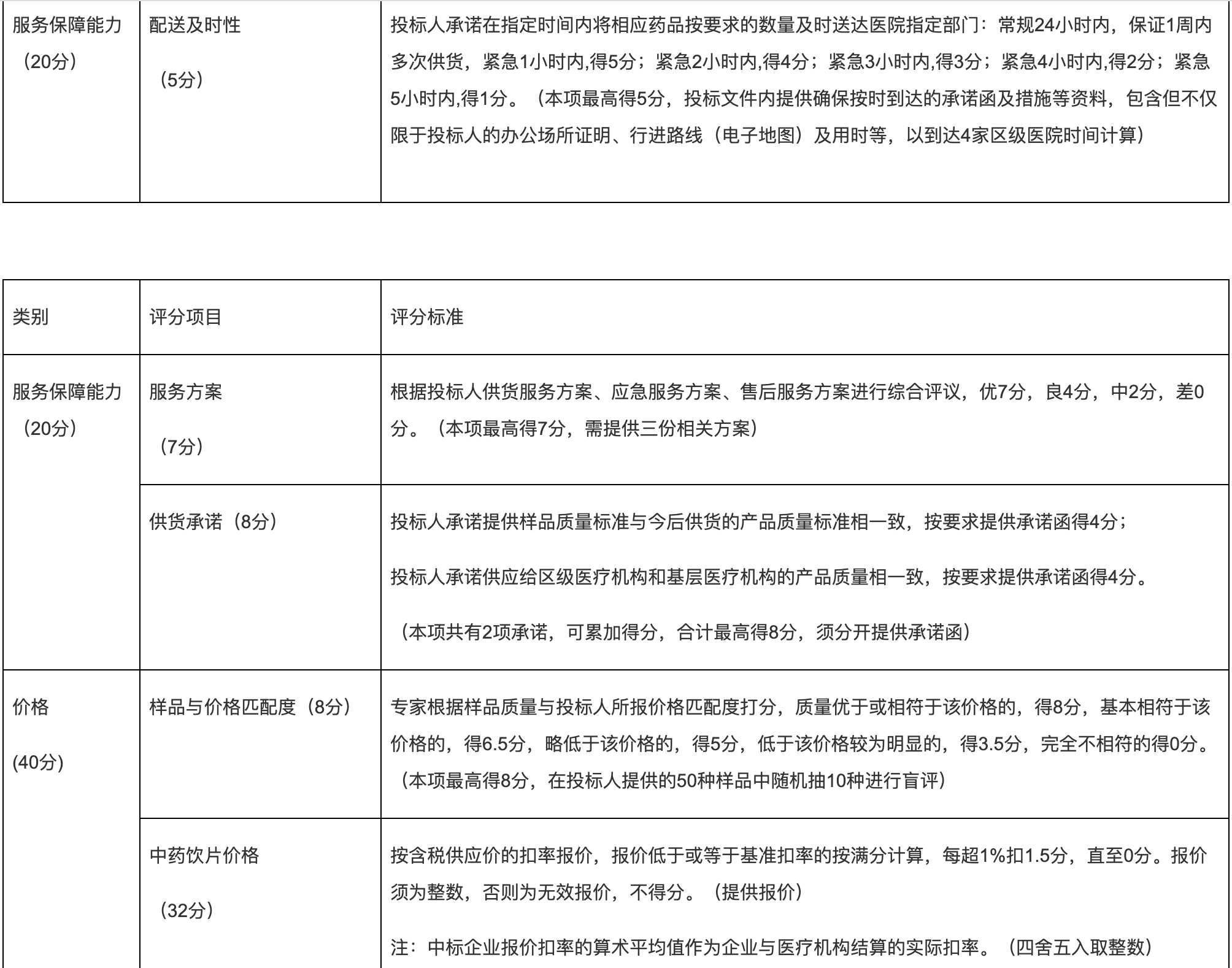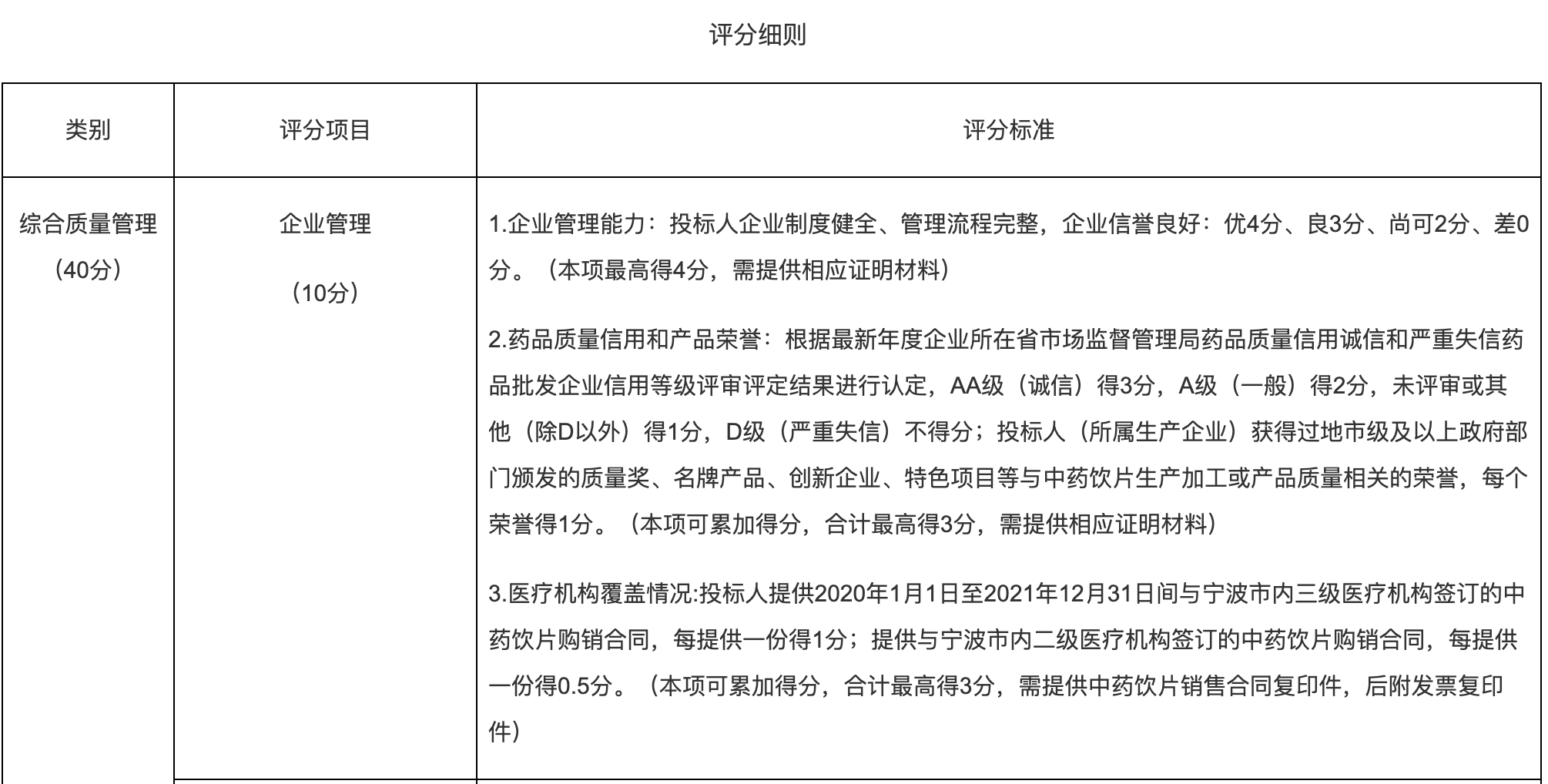 浙江省寧波市奉化區(qū)的中藥飲片集中采購(gòu)采取綜合評(píng)分制,總分為100分,其中綜合質(zhì)量管理40分、服務(wù)保障能力20分、價(jià)格40分,合計(jì)總分100分——綜合質(zhì)量管理40分,主要評(píng)估企業(yè)管理、企業(yè)規(guī)模、生產(chǎn)情況、質(zhì)量管控;服務(wù)保障能力20分,主要考察配送及時(shí)性、服務(wù)方案、供貨承諾;價(jià)格40分,由降幅與價(jià)格和質(zhì)量的匹配度構(gòu)成。