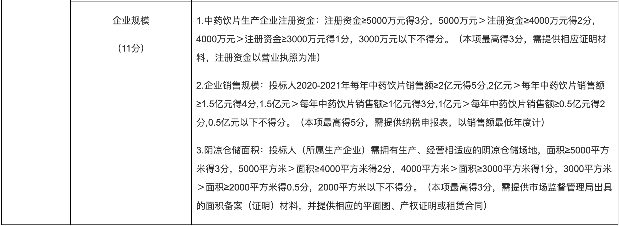 具體來(lái)看,中藥飲片生產(chǎn)企業(yè)注冊(cè)資金、企業(yè)銷(xiāo)售規(guī)模、醫(yī)療機(jī)構(gòu)覆蓋情況、陰涼倉(cāng)儲(chǔ)面積、生產(chǎn)品種數(shù)量、中藥材種植基地、企業(yè)成立時(shí)間和飲片質(zhì)量、企業(yè)配送的及時(shí)性均在考量范圍。