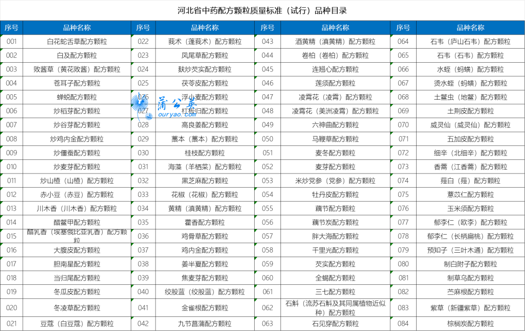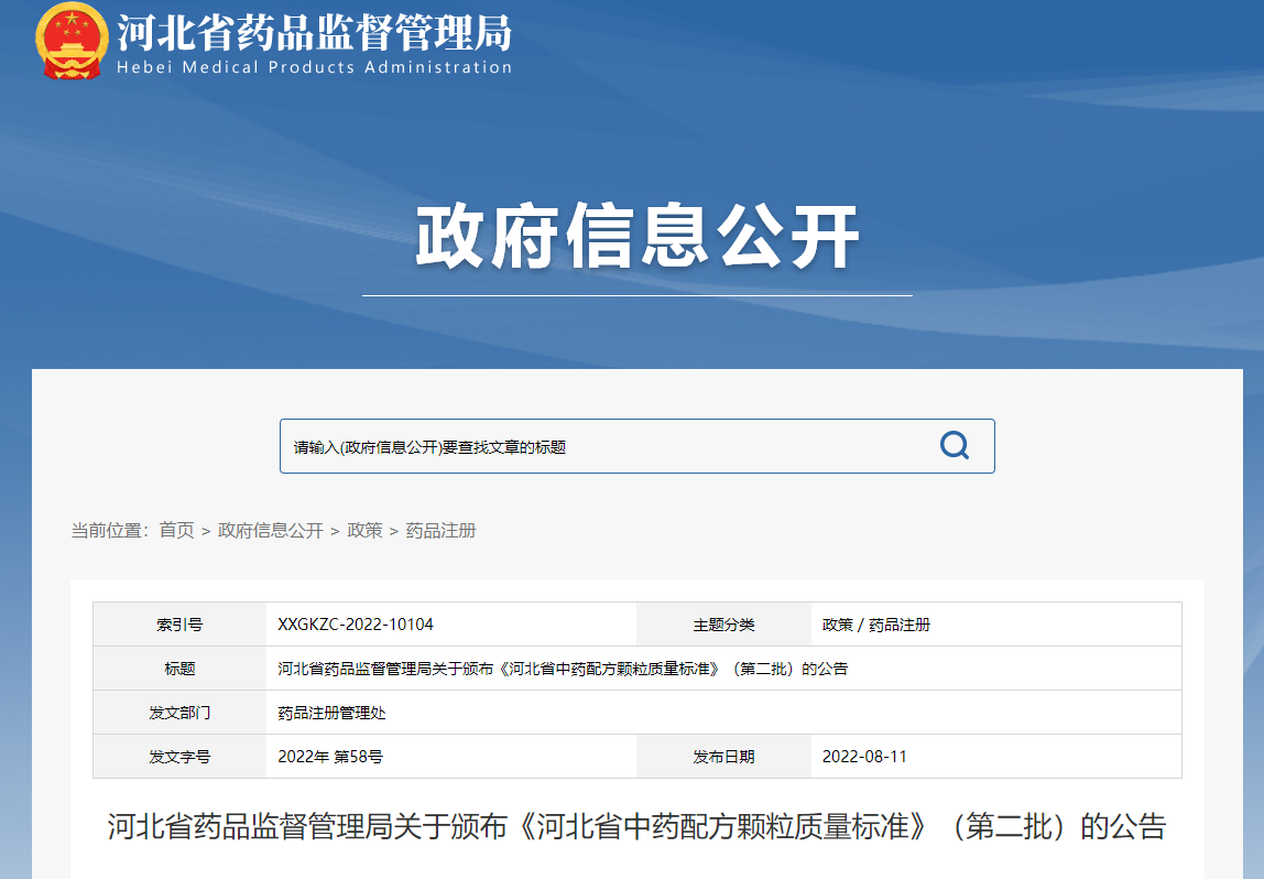 8月11日,河北省藥品監(jiān)督管理局關(guān)于頒布《河北省中藥配方顆粒質(zhì)量標(biāo)準(zhǔn)》(第二批)的公告,共計(jì)117個(gè)質(zhì)量標(biāo)準(zhǔn)(其中33個(gè)正式標(biāo)準(zhǔn)、84個(gè)試行標(biāo)準(zhǔn))的審定,現(xiàn)予以發(fā)布,自2022年8月15日起實(shí)施。