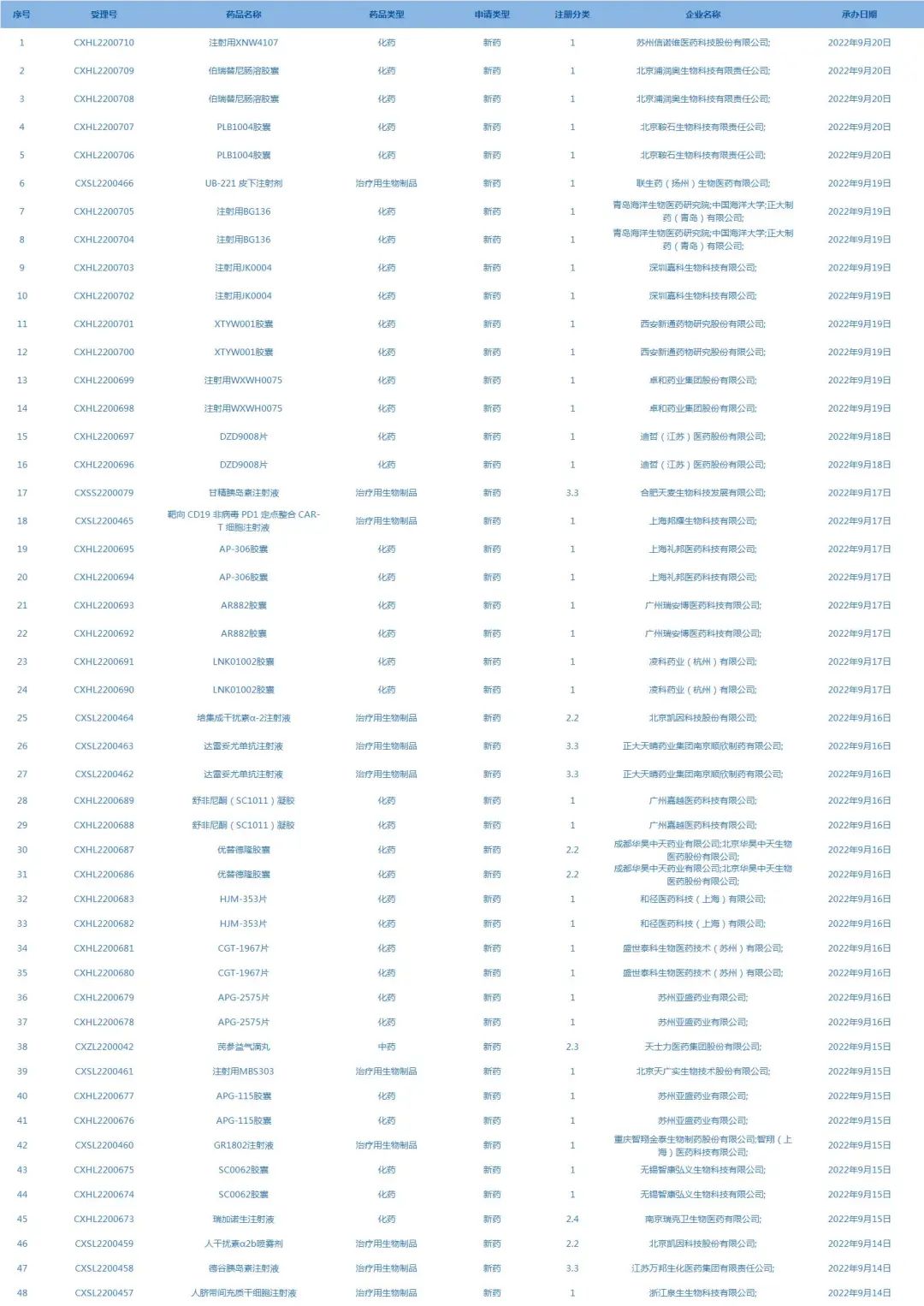 3.國家藥監(jiān)局藥品審評中心承辦受理48個新藥上市申請,包括伯瑞替尼腸溶膠囊等藥品(截至9月20日)。