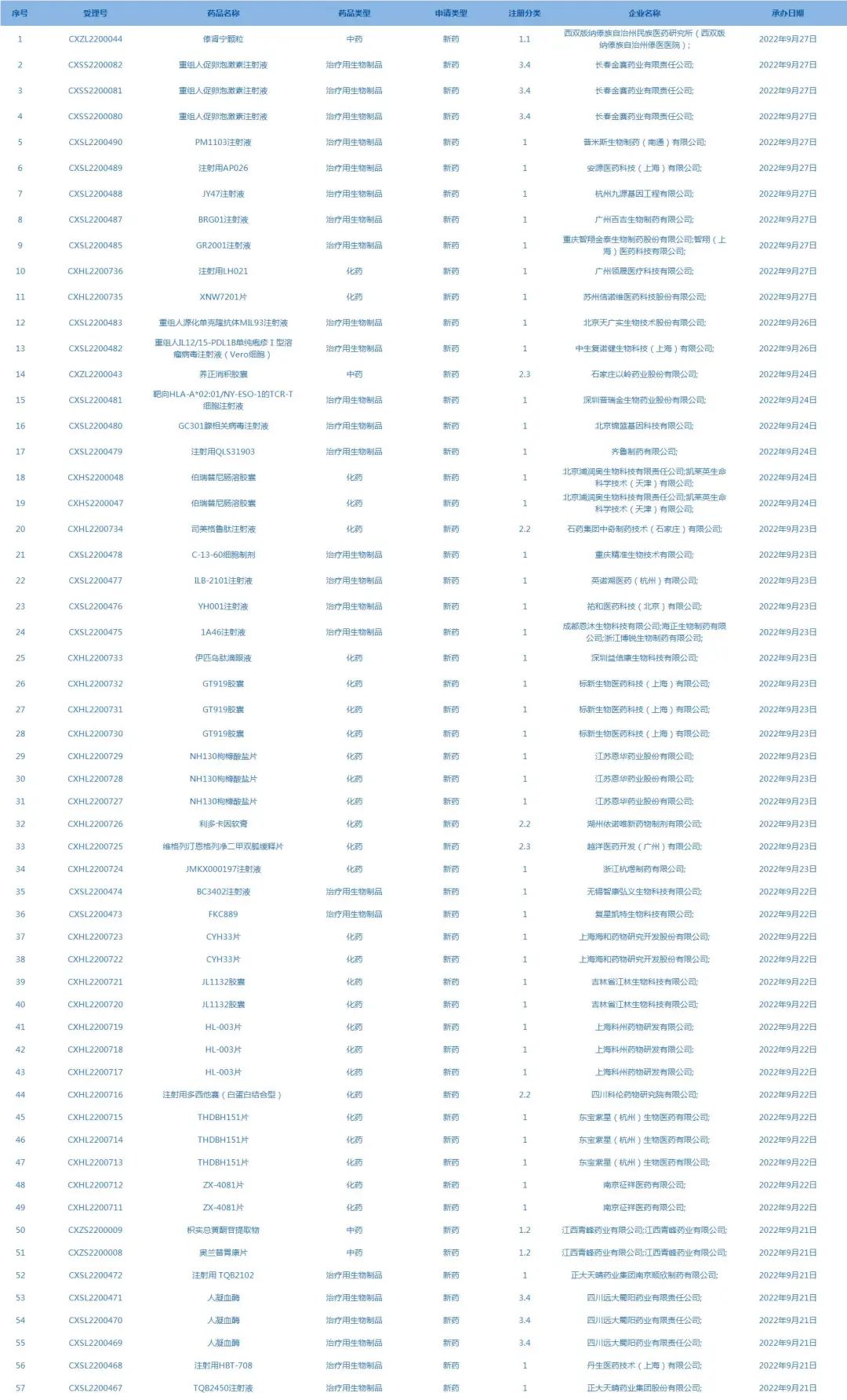 2.國家藥監(jiān)局藥品審評中心承辦受理57個(gè)新藥上市申請,包括傣腎寧顆粒等藥品(截至9月27日)。