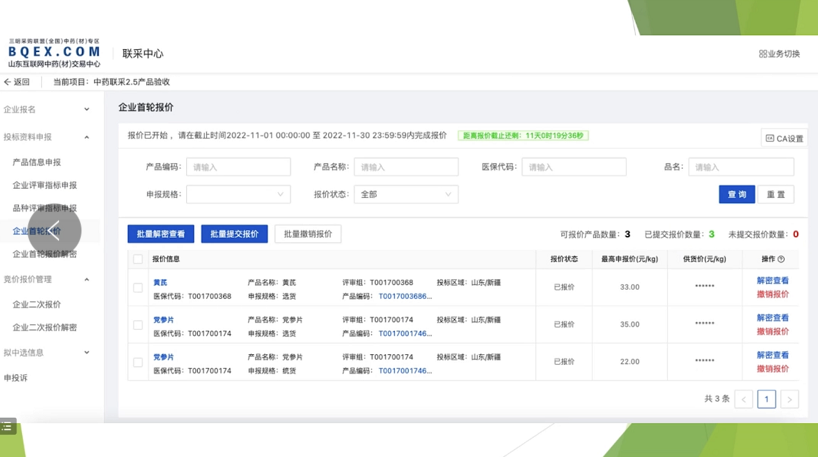 預(yù)計(jì)申報(bào)截止時(shí)間為12月2日,以交易平臺(tái)通知為準(zhǔn),交易平臺(tái)聯(lián)采申報(bào)系統(tǒng)將智能化提示,按照系統(tǒng)要求申報(bào)即可。