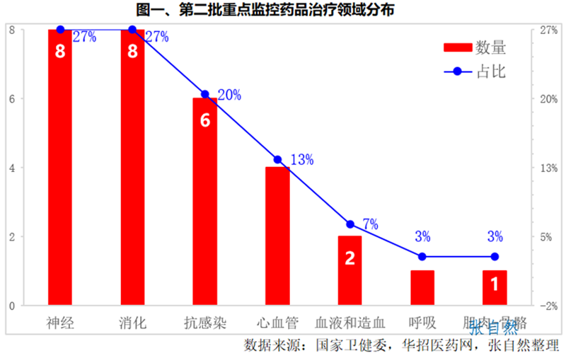 第二批30個重點監(jiān)控藥品中,神經(jīng)和消化系統(tǒng)藥物并列第一,各有8個品種,二者合計占目錄總數(shù)的一半以上(53%)。