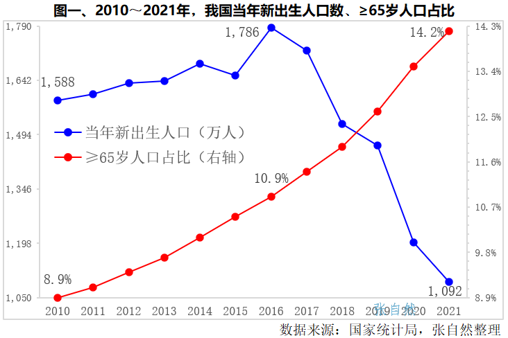我國當(dāng)年新出生人口數(shù)已由近年峰值2016年的1786萬人減少到2021年的1092萬人,5年下降了39%。≥65歲老人占總?cè)丝诘谋戎貏t由2010年的8.9%增加到2021年的14.2%,11年增加了5.9個百分點,≥65歲老人的數(shù)量由2010年的1.19億人增加到2021年的2億人,11年增加了8100萬人,增加了68%。
