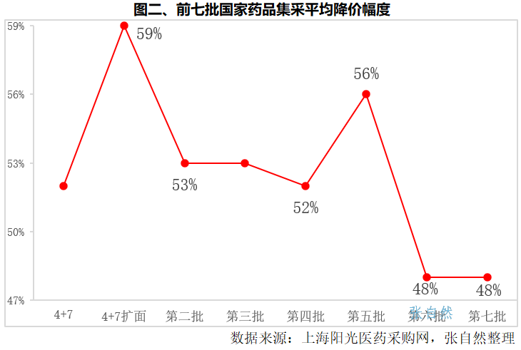 截至目前,國家藥品集采已進行了七批,降價幅度趨于緩和,平均降幅由4+7擴面時的59%下降到了第六批和第七批的48%,連今年9月進行的脊柱國家集采降幅也令業(yè)界感覺溫和了許多(詳見圖二)。