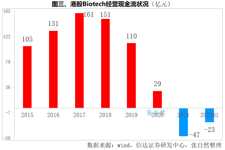 以港股Biotech為例,近年來,其經(jīng)營現(xiàn)金流持續(xù)下滑,去年開始成為負值,今年上半年仍未能轉(zhuǎn)負為正(詳見圖三)。
