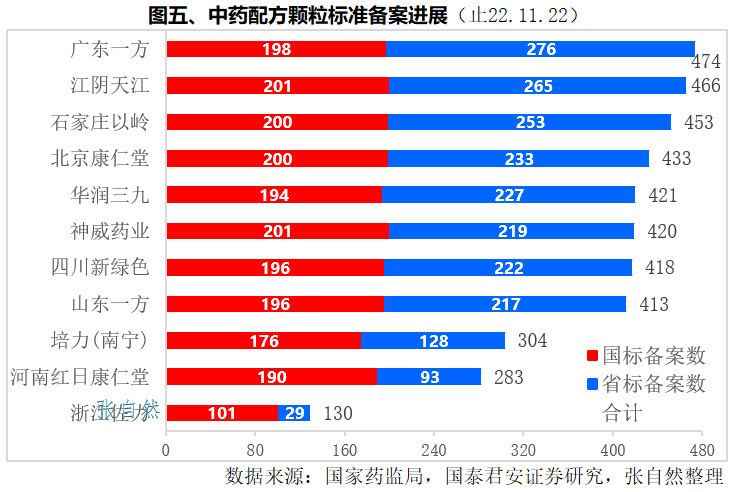自從2021年11月1日,配方顆粒放開后,各相關(guān)企業(yè)爭相在各省進行配方顆粒標(biāo)準(zhǔn)備案,由圖五可見,原國家試點企業(yè)在標(biāo)準(zhǔn)備案中保持優(yōu)勢,一方、天江、康仁堂、三九和新綠色備案進展均較快。