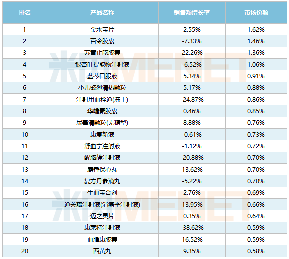 2022H1重點(diǎn)城市公立醫(yī)院中成藥產(chǎn)品TOP20